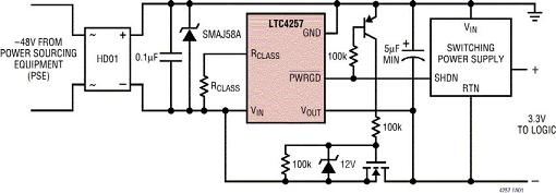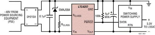 图1b:采用LTC4257实现的符合基本802.3af标准的PD电路。