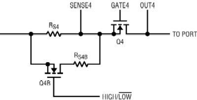 当Q4B关闭的时候,端口工作在符合802.3af标准的模式。打开Q4B开关,端口就工作在大电流模式。这种切换可以在任何时间进行:在检测/分类之前;在检测/分类之后,但是要在端口上电之前;或在供电之后。注意,Q4B可以采用低压MOSFET,因为仅仅Q4的漏极具有高端口电压。Q4B要选择导通电阻非常低的MOSFET,以防止在更大电流限制中精度不够。例如,IRLML2502就是采用SOT-23封装的一种合适的器件。