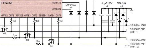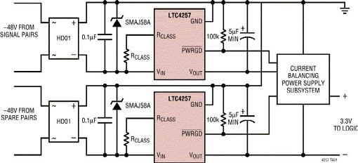 四对PD电路是最大的变化(图4b)。现在需要采用两个LTC4257器件,电源电路必须具备足够的智能,以便把从每一个通道吸取的电流限制在802.3af规范容许的范围之内。要做到这一点,就要平衡从每一对线吸取的电流或平衡从每一对线吸取的功率,直到它接近(但是不超过)ICUT极限,然后,才从其它线对吸取电流。这种电路可能相当复杂,不同的设计之间差异也很大。