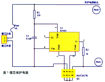 如图1所示,电芯?;さ缏分饕蒖5402和HAT2027共同组成。除此之外,自恢复保险丝起到了最后一层保护的作用。