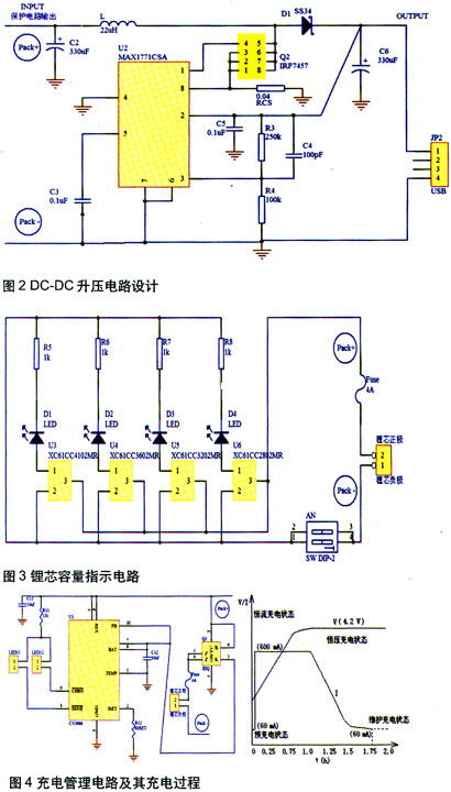 本文论述的电路系统设计由五部分组成:锂芯容量指示电路、电芯?;さ缏?、充电管理电路、DC-DC升压电路和功能扩展电路。锂芯容量指示电路由XC61CC系列的电压监控芯片组成。电芯?;さ缏酚晒浔;ぁ⒐疟;ぁ⒐卤;と糠肿槌?,HAT2027、R5402、自恢复保险丝构建了三重保护,使锂芯安全性大大增强。充电管理电路采用了CN3066,将充电过程分为涓流充电、恒流充电、恒压充电和维护充电四个部分,使移动随身电源能够最大程度地储备能量。DC-DC升压电路采用了MAX1771集成芯片,可将锂芯容量在安全范围内最大限度释放,达到对多种数码设备供电的目的。功能扩展涵盖了户外活动所涉及的常见需求,具有应急夜间高亮照、户外防盗安全警报、野营驱蚊等功能。