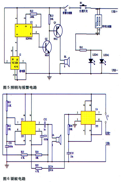 如图5所示,当按下预报警功能键时,USB输出电压加载在报警系统上,此时移动随身电源处于"预报警"状态。当水银开关B1位置偏移正常的断开位置,将触发继电器工作,使KD9561音乐片工作,发出报警响声,提醒注意安全。