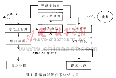 异步电动机智能软起动器硬件系统结构如图1所示。本设计采用AT89C51单片机作为整个控制系统的核心。零电压检测电路用于检测相电压的过零点;触发电路用其作为同步信号;断相检测电路用于判断断相故障。触发电路采用全数字化移相控制电路,与零电压检测电路配合,在单片机的控制下,产生移相触发脉冲来调节电机端电压;电流检测电路采用霍尔电流传感器将电流信号转换为电压信号送入A/D转换器,实现电机定子电流的检测,提供软起动和过载?;さ囊谰?显示控制器用来控制LED,用以显示工作参数和状态;键盘电路用于输入系统的参数和控制单片机程序的走向。主要电路的设计说明如下。
