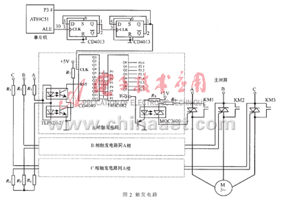 晶闸管触发信号的产生:在每1相都串入光耦TLP521,以A相为例,2个光电耦合器TLP521按图2所示接入。另一光电耦合器MOC3020的输出1个脚接主回路A相双向晶闸管的1个阳极,另一脚接触发极。光耦TLP521和MOC3020都起到了控制回路与主回路相隔离的作用。计数器CD4040是12位计数器,将其Q5~Q12输出端与74HC682输入端P0~P7相连。A相电压在1个周期有2个过零点,过零时2个光耦内部的发光二极管均不导通,CD4040的RST端为高电平,CD4040清零并开始计数,计数频率由其时钟端(CLK)输入脉冲控制(来自四分频器),由程序传送给单片机的P2口1个设定数,P2口与74HC682的Q0~Q7端相连。74HC682是数值比较器,当由P0~P7组成的二进制数大于由Q0~Q7组成的二进制数时,其P>Q非端输出低电平,光耦MOC3020导通,晶闸管的触发回路便有触发电流通过,双向晶闸管导通。该触发电路没有采用传统的触发脉冲调制放大电路,设计和实施上更为简单。