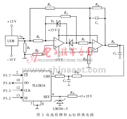 软起动的主要任务是控制主电路的电流,因此要对电流进行检测和监控。电流检测和A/D转换电路如图3所示。本装置采用LEM电流传感器进行主回路电流的检测,其主要优点是LEM电流传感器可以测量任意波形的电流及瞬态峰值,副边电流能真实地反映原边电流的波形,原边电路与副边电路之间完全绝缘,可靠性高,而且动态性能好,精度高,因此能够很好地满足工业现场应用的需要。为减小误差保证转换精度,没有采用传统的桥式二极管整流电路对LEM??槭涑龅牡缌鹘姓?,而是采用由2个运放组成的精密全波整流电路进行整流并滤波,得到与交流电流成比例变化的0~5V的直流电压信号送入A/D转换器TLC0834转换成二进制数送入单片机,以此信号作为改变晶闸管触发角大小的依据,并用于数码管显示。TLC0834是8位串行控制模数转换器,以5V作为基准电压,通过与控制处理器相连的串行数据链路传送控制命令,用软件对通道选择和输入端进行配置。多路器寻址通过TLC0834的DI端移入转换器。TLC0834的DI、CLK、DO和/CS分别与单片机的P3.2、P3.3、P3.6和P3.7端口连接。程序中置/CS为低,使TLC0834能够工作,并对转换器初始化;然后从处理器接收1个时钟,在每个时钟的上升跳变时,DI端的数据移入多路器地址移位寄存器。在转换过程中,转换数据同时从DO端输出。这样TLC0834将输入电压转换成二进制数送入单片机后进行处理和显示。