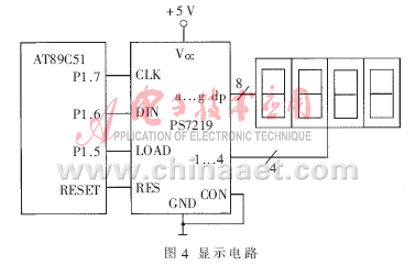 显示电路如图4所示,由高性能的多位LED显示驱动器PS7219控制。PS7219内部具有15×8BRAM功能控制器寄存器,寻址方便;其复位引脚与单片机的复位端连接,LOAD、DIN和CLK端分别与单片机的P1.5、P1.6和P1.7端口连接。LOAD脚的功能是装载数据输入,当它为高电平时,串行输入数据的最后16位被锁定。串行数据的传送格式为D15~D0,其中D15~D12为无关位,D11~D8为寄存器地址,D7~D0为数据位;DIN脚的功能是串行数据输入,发送到DIN端的16位数据在每个CLK的下降沿被移入到内部16位寄存器中;然后,在LOAD的上升沿,数据被锁存到数值或控制寄存器中。