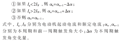 (3)软起动模块:根据电动机电流检测信号,经单片机分析和处理后得到当前晶闸管触发角的大小,以实现电机的限流起动。以起动电流限定为2倍的额定电流为例,触发角控制算法如下: