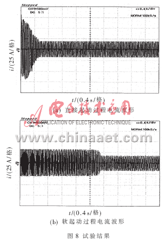 图8为电机起动过程实测电流波形,图8(a)为直接起动过程电流波形,图8(b)为软起动过程电流波形。可见整个软起动过程中电流的变化很平稳,没有出现振荡现象,电机软起动时的起动电流是其稳定运行电流的2倍左右,而直接起动非常迅速,启动电流很大,直接起动时的起动电流是其稳定运行电流的5~7倍。试验结果表明,所设计的软起动器系统效果良好,起动过程平稳,无冲击和振荡。