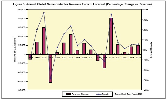 iSuppli公司预测,半导体产业将连续增长七个季度,然后在2011年第一季度出现季节性下降。 这将是该产业在1991至1995年期间连续增长19个季度之后,连续增长时间最长的一次。