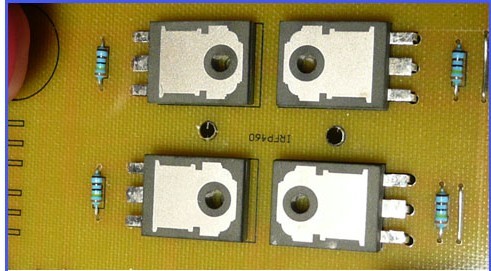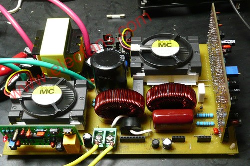 本机前级功率管和H桥的功率管都用风扇散热(安装方法下面再详述),这是一种小型仪表风扇,比电脑上的CPU风扇还要小一点,实验证明,在600W输出的情况下,H桥的4个功率管散热不成问题,但前级的二个功率管好象散热不够一点,如果有可能,最好用大一点的风扇。