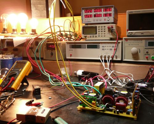 在前后级都正常的情况下,可以把前后级联起来,完成整机调试把前级的DC-DC驱动板重新插上,后级AC输出端的负载去掉,接上示波器(示波器最好用1:100的高压探头)和万用表(AC700V档),把高压保险丝换成一个0.5A的。下面要做的事是:开机!即按一下DC-DC驱动板的启动开关,成败在此一举,如果后级元件耐压没有问题,此时,应该在示波器上看到正弦波了,波形应该很漂亮。这里,调整SPWM驱动板的多圈电位器R7,就可以看到输出电压在变化,把它调在225V左右停下。