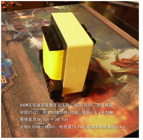 主变压器是制作逆变器成功与否的关健,本机主变用的磁芯为EE55,材质PC40,我在杭州电子市场买到了一种质量很好的骨架,立式的,脚位11加11,脚粗1.2MM。绕制数据:初级2T加2T,用10根0.93的线。初级导线总面积为6.8平方MM,次级为0.93线一根,绕60T。