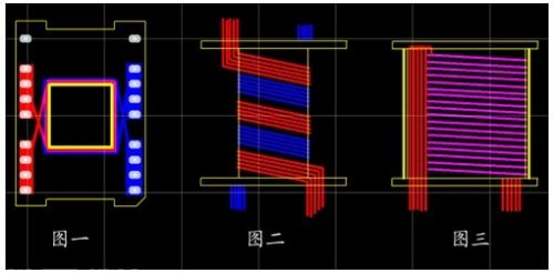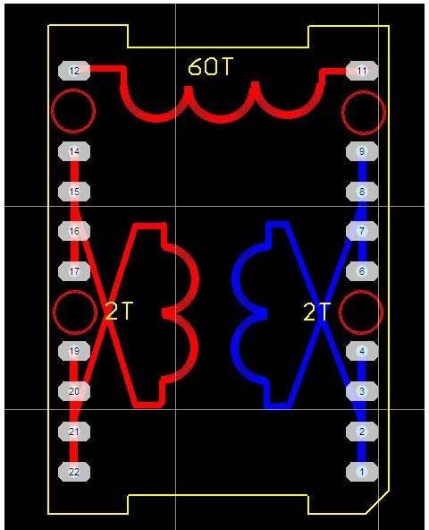 先用5根0.93线绕2圈(见图二中红线),中间留空隙,再在空隙处用另外5根线绕2圈(见图二中蓝线),每根线长约37CM。用同样的方法绕二层,层间包二层胶带,这样就相当于用了10根线并绕。绕完低压绕组,在绕组外用高温胶带包三层。绕低压绕组要注意的问题是:线头留在下面,即骨架引脚处,线尾留长一点,暂时留在骨架的上面(等绕完高压绕组后要向下折下来)。从(图一)可以看出,实际上,低压绕组的头和尾是有一段是重叠的,也就是不是2圈,而是约2.2圈,这样做可以大大减少漏感。