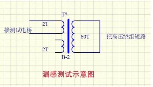 我发现用这种方法绕制的变压器漏感比较小。以前用铜带绕制,漏感一般在0.8uH以上,现在可以做到0.4uH以下。我想原因是:因为铜带要焊引出线头,这样就留下了一个锡堆,再绕高压绕组时,中间就有一个空隙,导致耦合不紧。下图为测试漏感示意图。