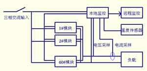 大功率电动汽车充电机的输入为额定线电压380V、50Hz的三相交流电,输出额定电压700V,额定电流600A。系统采用19"标准机架,结构紧凑、布局合理、外型美观大方。外型尺寸:高×宽×深为2200mm×600mm×600mm。采用60个??椴⒘?,每个???0A/700V,??槌叽纾焊?times;宽×深为133mm×425mm×270mm,15层4列,分四个柜体安放,四个柜体可分开运输,使用时紧凑左右排列?;芮懊?、后门均为双开门,方便检修。电源进线和汇流排输出位置均在底部输入。电源输入断路器及监控单元触摸屏安装在主机中间控制柜前部。充电机控制结构示意图如图2所示。
