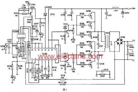 图1为汽车音响开关电源电路,该电路主要由两片集成电路TL494和KIA358、驱动管Q702和Q703、开关管M704~M709、变压器、输出整流器和滤波器等组成。TL494是一个脉宽调制型开关电源集成控制器,其最大驱动电流为250mA,工作频率为1~300kHz,输出方式可选推挽或单端形式。内部方框图如图2所示,详细资料参考TL494脉宽调制控制电路。它主要由一个三角波振荡器、两个比较器CMP1和CMP2、两个误差放大器A1和A2、5V基准电压源、触发器及输出驱动器等组成。