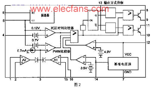 死区时间由4脚电压来设定,范围为0~3.3V之间。误差放大器A1作为输出电压取样误差放大,结果通过PWM比较器控制脉宽使输出电压稳定。误差放大器A2作为?;た刂朴?,15脚接参考电压5V(由14脚提供),16脚为控制输入。在开机保护、过温或过流?;な?,16脚为高电平,这时,误差放大器A2输出高电平,该电平高于振荡器三角波电平幅值,而使驱动器没有驱动脉冲输出,负载安全停电。