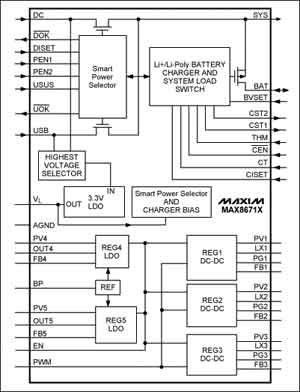MAX8671XPMIC集成了DC/USB输入过压保护、单节Li+电池充电器以及电池和外部电源之间负载切换所需的功率开关。集成开关和调节器可以省去外部MOSFET以及杂乱的电压检测器、电流检测电阻、比较器、定时器以及其他常见的用于电源监测和切换的分立元件。