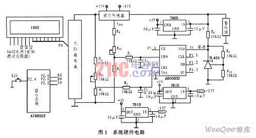 单片机正常运行需要为片内的晶体管或场效应管供给电源,使其工作在相应状态。AT89S52需要一个5V电源(实际工作电压为3.6~6.0V)??捎谜鳌⑽妊狗绞焦┑?,获得4.5V左右的电压,因本系统为独立发电,且长期使用,考虑到电源寿命,该装置由市电或干电池提供驱动电源不符合实际,所以最佳方案应该由系统内部太阳能电池的蓄电池供电,经稳压集成块7805稳压为5V,输入单片机Vcc引脚,驱动单片机及液晶显示装置。TBCl0SY霍尔电流传感器,需±15V双电源供电,同样采用系统内的蓄电池供电.经稳压集成块7805、7915稳压在±15V,从而驱动其工作。