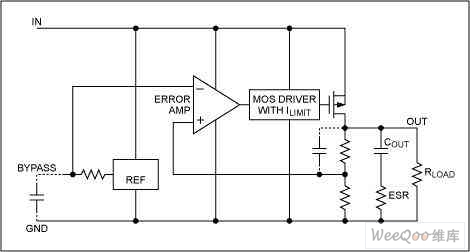 低压差线性稳压器(LDO)的结构主要包括启动电路、恒流源偏置单元、使能电路、调整元件、基准源、误差放大器、反馈电阻网络,?;さ缏返?,基本工作原理是这样的:系统加电,如果使能脚处于高电平时,电路开始启动,恒流源电路给整个电路提供偏置,基准源电压快速建立,输出随着输入不断上升,当输出即将达到规定值时,由反馈网络得到的输出反馈电压也接近于基准电压值,此时误差放大器将输出反馈电压和基准电压之间的误差小信号进行放大,再经调整管放大到输出,从而形成负反馈,保证了输出电压稳定在规定值上;同理如果输入电压变化或输出电流变化,这个闭环回路将使输出电压保持不变,即: