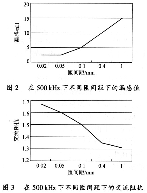 图2与图3给出了在不同的间隙下漏感和交流阻抗的变化,可以明显地看出间隙越大,漏感越大,交流阻抗越小。在间隙增加1mm的状况下漏感值增加了5倍之多。因此,在满足电气绝缘的情况下,应该选用最薄的绝缘体来获得最小的漏感值。