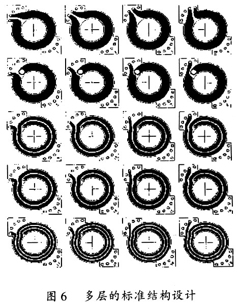 在双面PCB板的每一层都是由一到多匝的绕组组成的,而且所有的层都保持着一样的物理特性:即相同的形状和相同的外部连接点。在有些多匝的层次中,这个外部连接点是不同匝数间的电气连接点。如果有些层只有一匝,它也可以被印制在PCB的双面来降低交流阻抗。使用铜箔直接印制在PCB板上来替代传统的导线,即使在许多需要很多匝数的开关电源中,变压器依旧能保持一个很小的体积,这便大大减小了整机的体积。具体的设计步奏和注意事项请参阅文献[3]。图6显示了一个顶层的标准匝数设计的例子,它使用的是罐形(RM)磁芯。