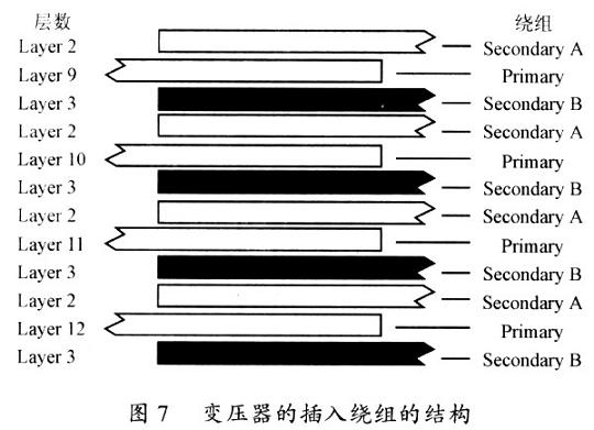 插入技术是指在布置变压器原、副边绕组时,使原边绕组与副边绕组交替放置,增加原、副边绕组的耦合以减小漏感,同时使得电流平均分布,减小变压器损耗。