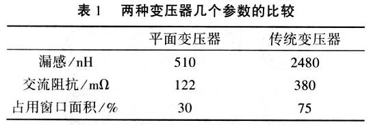 为了比较平面变压器和传统变压器,分别做了两种变压器的模型,一种使用平面结构并使用了插入技术,另一种使用铜线分别在初级和次级绕制而成。两种变压器都被运用于一个互补控制的半桥变换器中。两个变压器的参数如下: