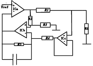 电压-电流转换模块的组成还有另外一种方案,采用3个运放构成输出电流可变的电流源,如图3所示。输出电流I=Vi/R1,为使R1两端的电压保持恒定,由差分放大器IC1b通过射随器IC1c监测R1两端的电位,此电位经IC1b的7脚加到比较器ICa的反相输入端与Vref比较。比较结果使比较器的输出端变化,直到平衡为止,即Vr1=Vi。电路中的电容用于补偿ICa的频率,减少控制环路的延时。只要R1=R2=R3=R4=R5,此电路的性能较好。但此电路的带负载能力不强,环路延时补偿对电路的稳定有较大影响。