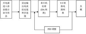 系统软件设计在凌阳十六单片机应用开发工具unSPIDE1.16.1中进行,采用凌阳单片机汇编语言和标准C语言对单片机进行编程。主要实现5个功能:(1)系统的初始化,包括各外围接口设备的初始化;(2)键盘输入;(3)D/A、A/D转换;(4)PID算法进行电流调整;(5)语音提示和电流显示。其主程序流程图如图5所示。