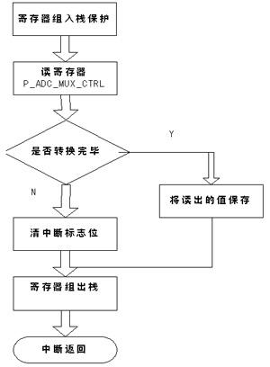 A/D转换部分程序主要用于将采样电阻采到的模拟电压信号转换为数字信号。采样信号由IoA6输入并直接送入缓冲器P_ADC_MUX_Data,在ADC自动方式被启用后,会产生一个启动信号,此时,RDY=0,DAC0的电压模拟量与外部的采样模拟比较,以尽快找出外部信号模拟量的数字量,A/D转换的结果保存在SAR内。当10位A/D转换完成时,RDY=1,此时,通过读P_ADC_MUX_Data单元可以获得10位A/D转换的数据。其IRQ1中断服务程序的流程图如图6所示。