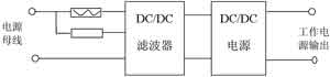 电源控制器中遥测变换电路使用的二次电源以母线电源为输入电源,工作电源采用DC/DC变换型电源。设计选用了成品INTERPOINT公司电源??椋缭词淙攵耸褂昧烁霉镜腅MI-461滤波器,保险丝与限流电阻并联?;ご胧;さ缏啡缤?所示。