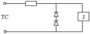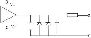 按建造设计规范要求,遥测输出采用了双向限幅电路和限流?;ご胧;さ缏啡缤?所示。