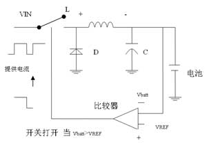 快速调节器的操作是通过控制一个晶体管开关的占空比来实现的。占空比会自动增加以使电池流入更多的电流。当VBATT<VREF时,一个比较器会将开关闭合(参见图5a),电流流入电池和电容C,这个电流同时也存储在电感L中。VBATT持续升高,直到超过VREF,调节此时比较器将开关断开(参见图5b),存储在电感中的电流迅速下降直到二极管偏置,使得电感电流以减速度流入电池,电容C在电感电流衰减后开始放电。并且最后VBATT开始下降,当VBATT低于VREF时,比较器再次将开关闭合并开始另一次循环。在较大的范围内如果减小占空缩短闭合的时间,平均电压就会下降,反之亦然。因此可以通过控制占空比的方法调节电压或电流至所需要的值。