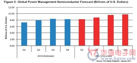 2011 年推动全球电源管理半导体销售额继续增长的因素,包括产业寻求进一步提高电池驱动设备的效率。全球各地的消费者都希望手机、平板电脑、笔记本电脑和便携导航设备等移动设备的电池具有更长的寿命,可能促使电源管理IC领域出现新的设计趋势,从而提供供应商的营业收入。