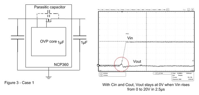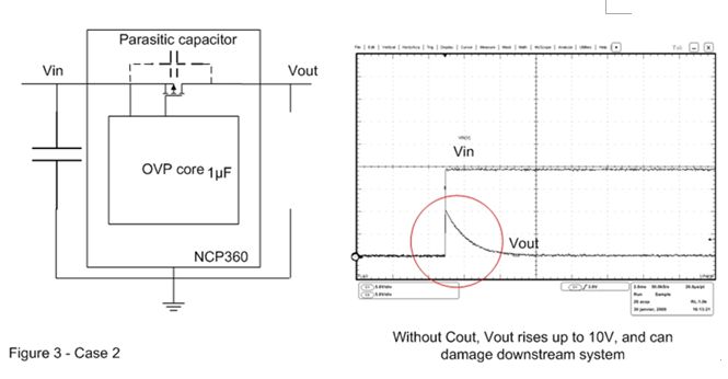 在图3的案例2中,输出电容已被移除。这样,当OVP器件输入端出现快速输入瞬态现象时,旁路元件将保持开路。这时可以在输出端观察到过 冲,这个过冲可能会损坏连接至OVP输出端的电子元器件。为了解决这个问题,必须在输出引脚上连接一个输出电容,并尽量靠近OVP器件摆放。