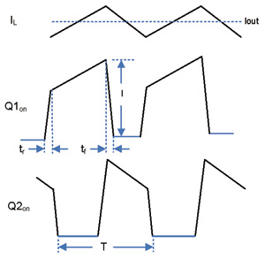 在频域内测量辐射和传导电磁干扰,这就是对已知波形做傅里叶级数展开,本文中我们着重考虑辐射电磁干扰性能。在同步降压转换器中,引起电磁干扰的主要开关波形是由Q1和Q2产生的,也就是每个场效应管在其各自导通周期内从漏极到源极的电流di/dt。图2所示的电流波形(Q1on和Q2on)不是很规则的梯形,但是我们的操作自由度也就更大,因为导体电流的过渡相对较慢,所以可以应用HenryOtt经典著作《电子系统中的噪声降低技术》中的公式1。我们发现,对于一个类似的波形,其上升和下降时间会直接影响谐波振幅或傅里叶系数(In)。