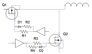 谐波系列的电磁干扰幅度受Q1和Q2的通断影响。在测量漏源电压VDS的上升时间tr和下降时间tf,或流经Q1和Q2的电流上升率di/dt时,可以很明显看到这一点。这也表示,我们可以很简单地通过减缓Q1或Q2的通断速度来降低电磁干扰水平。事实正是如此,延长开关时间的确对频率高于f=1/πtr的谐波有很大影响。不过,此时必须在增加散热和降低损耗间进行折中。尽管如此,对这些参数加以控制仍是一个好方法,它有助于在电磁干扰和热性能间取得平衡。具体可以通过增加一个小阻值电阻(通常小于5Ω)实现,该电阻与Q1和Q2的栅极串联即可控制tr和tf,你也可以给栅极电阻串联一个"关断二极管"来独立控制过渡时间tr或tf(见图3)。这其实是一个迭代过程,甚至连经验最丰富的电源设计人员都使用这种方法。我们的最终目标是通过放慢晶体管的通断速度,使电磁干扰降低至可接受的水平,同时保证其温度足够低以确保稳定性。