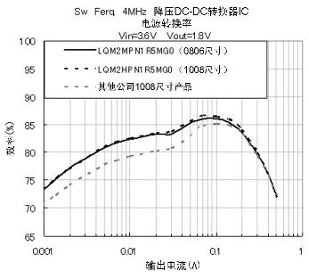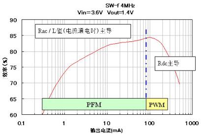 DC-DC转换器的电源转换效率和功率电感性能之间的关联如图3所示。PFM是指手机在待机状态下保持低电流负荷的模式,这时电源转换效率性能是与功率电感的Rac(交流电阻)以及电流-感值偏执特性相关。图4当中显示了各功率电感的Rac特性以及图5中开关频率数是4MHz的DC-DC转换器IC的电源转换效率特性。