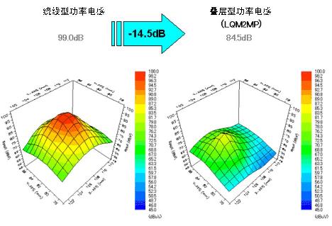 图6显示了绕线型功率电感和叠层型功率电感的磁束泄漏监测数据。与一直以来作为DC-DC转换器上使用的主要功率电感的绕线型功率电感相比,叠层型功率电感的磁束泄漏更少,现已证实闭合磁路的构造使磁束泄漏较少。这些数据表明在小型高速开关DC-DC转换器电路中使用小型叠层型功率电感的情况下,能够发挥它抗噪特性的特长。