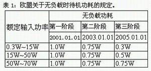 在环保意识日益受到重视的绿色时代,有效利用有限的能源已经成为人们的共识。欧美国家对于电器产品在空载待机时的功耗定义了明确的规范,欧盟(EEC)公布的具体规定如表1所示,而在美国方面,从2001年7月起该国就规定政府机构不得购买待机功耗超过1W的电器产品。由此可见,在不久的未来,电源转换器低待机功耗将成为基本要求,这也是电源设计工程师必须面临的挑战。