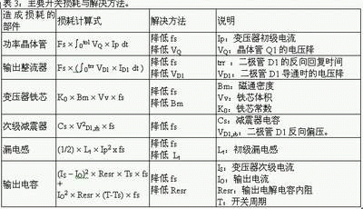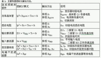 开关电源的损耗包含导通损耗、开关损耗以及外围控制电路损耗,电路不同部分的损耗成因各不相同,因此抑制损耗的方法也有不同。需要用数学方程式量化这些损耗,进而整理出降低各部分损耗的方法,才能得出具体有效降低整体损耗的方案。为了讨论方便,本文以常用的回扫转换器为例,将各部分损耗以数学方程式表示,并列出解决方法。表2、表3及表4分别为导通损耗、切换损耗以及外围控制电路损耗的原因分析与解决对策。