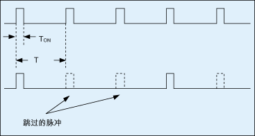 图1为脉冲跳跃技术示意图。当负载降低时,驱动功率开关的开关脉冲将被遮蔽(即跳过),部分脉冲被省略也即等效于降低了开关频率,可降低高频开关带来的损耗,然而这种降频方式会造成输出电压突降或突升(图2)。