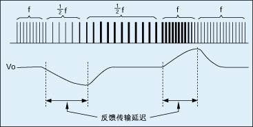 当负载降低到一定程度时,脉冲跳跃机制将使有效开关频率减半,这意味着转换器供应负载的功率减半,因此回扫电路将增加脉冲宽度以补足输出负载所需要的功率,而在脉冲宽度增加到负载所需功率之前,输出电压将产生突降。相反的情形发生在等效开关频率增加时,输出电压将发生突升。这种负载变动时输出电压突升与突降是开关频率非连续变动(以整数倍增加或降低)的必然结果。