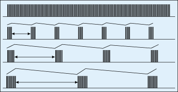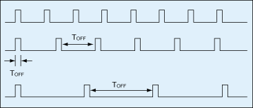 突变模式技术又称打嗝模式(hiccupmode)或周期省略模式(图3)。在负载很大情况下,回扫电路根据输出电压变化来调制脉冲宽度。当负载降低到一定程度时,控制电路将维持原有脉冲宽度,转而周期性跳过部分脉冲,控制电路通过降低总脉冲宽度或增加遮蔽周期长度达到降低损耗的目的。该技术有两个明显的缺点,即低频干扰会和遮蔽周期一起出现,而且负载突然改变也会造成输出电压突降。