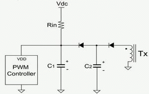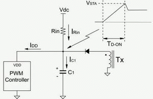 起动电路损耗在电源转换器空载待机损耗中占很高的比例,此处我们介绍一种起动速度快且损耗低的起动电路。图6(a)为传统起动电路,其中VSTA是脉宽调制控制器起始临界电压,TD_ON是启动延迟时间,TD_ON=(C1×VSTA)/IC1。使用较大输入电阻(Rin)可以有效降低电阻损耗,但启动延迟时间会延长。因此建议采用图6(b)电路,其中C1电容较小,这样在用大输入电阻时能够降低起动电路的损耗,同时仍然拥有较快起动速度。较大的C2电容可提供稳定的电压给控制器使用,不会增加起动延迟时间。