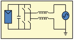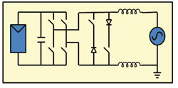 无变压器的DC/AC逆变器在欧洲广泛应用,但是在美国,这种产品只是最近才在某些地区被使用。无变压器的逆变器拓扑结构有很多种,而Fraunhofer研究所开发的HERIC拓扑表现出了很高的效率。传统的全桥逆变器的结构如图1所示,HERIC拓扑如图2所示,此图中还显示了两种新的开关/二极管对。这种拓扑利用独有的续流路径来减小开关和导通损耗,使效率提升到98%以上。