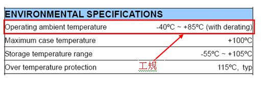 一般温度操作可分成商规(0℃~+60℃)、工规(-25℃~+71℃)、军规(-55℃~+85℃)等,在选择DC/DC 电源模块时需考虑实际系统操作温度范围,选用合适的温度等级。