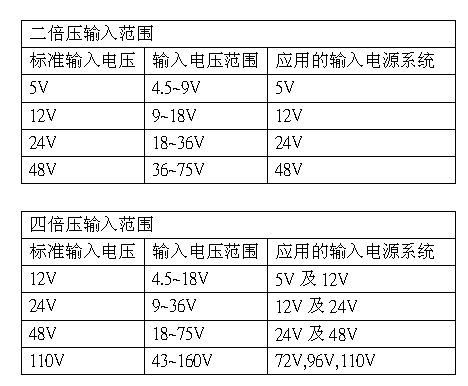 在选用电源??槭淙氲缪狗段?,视输入电压变动范围,业界有二倍压输入及四倍压输入可选择,电压范围如下: