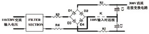 浪涌电流的抑制方法有很多,一般中小功率电源中采用电阻限流的办法抑制开机浪涌电流。图2是一个常见的110V/220V双输入电源示意图,以此为例,我们分析一下如何使用NTC热敏电阻进行浪涌电流的抑制。